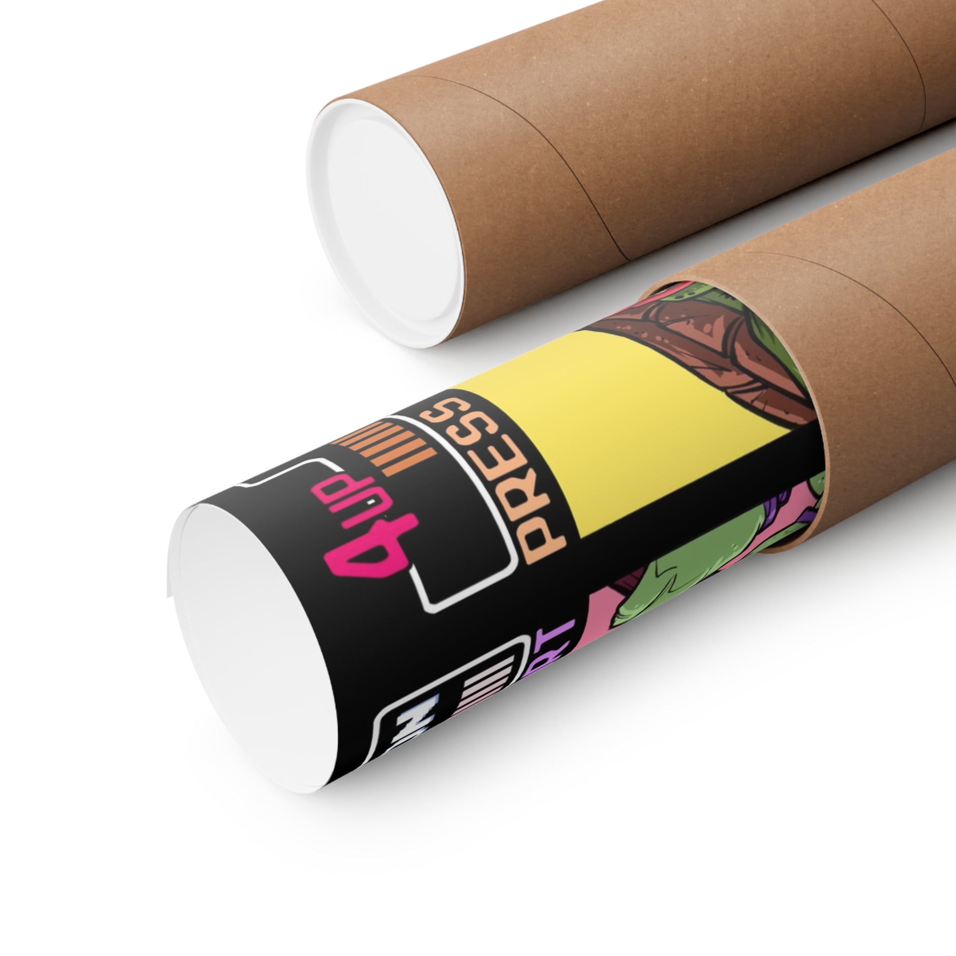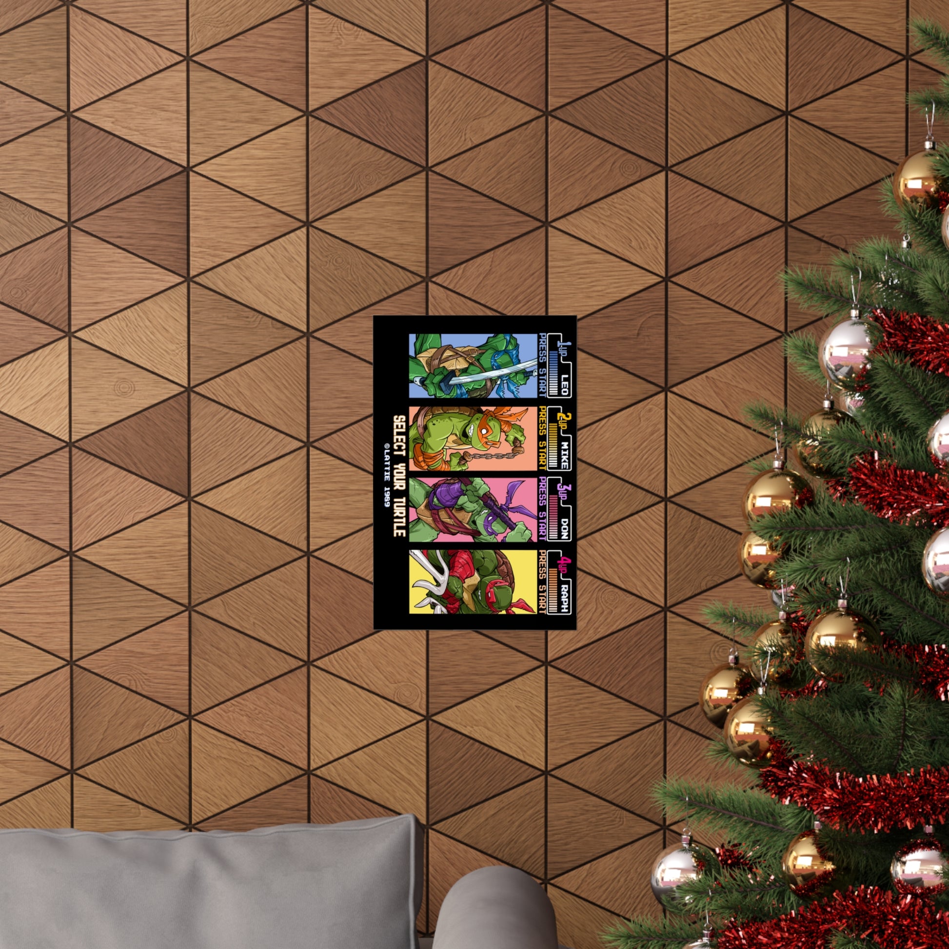Step back into the era of side-scrolling heroes with Select Your Turtle, a retro-gaming art print by comic artist Tim Lattie. Inspired by the classic arcade and console games of the late ’80s and early ’90s, it features Leonardo, Michelangelo, Donatello, and Raphael geared up for action.